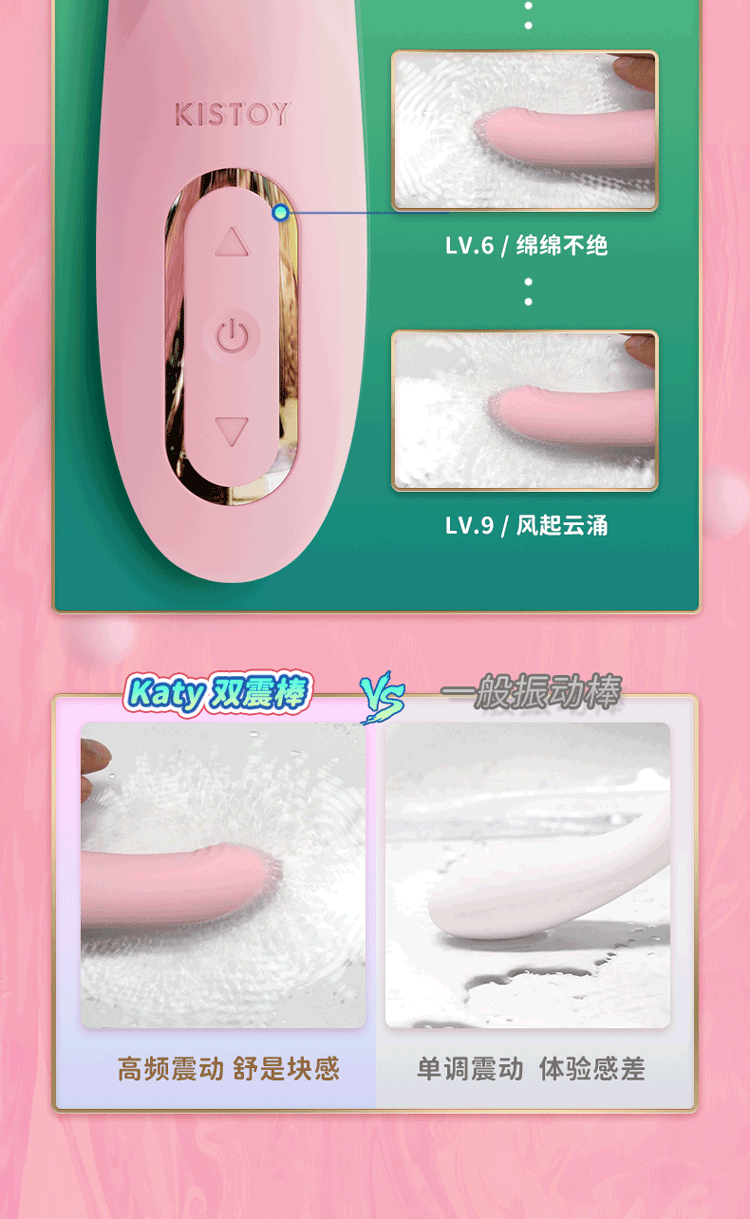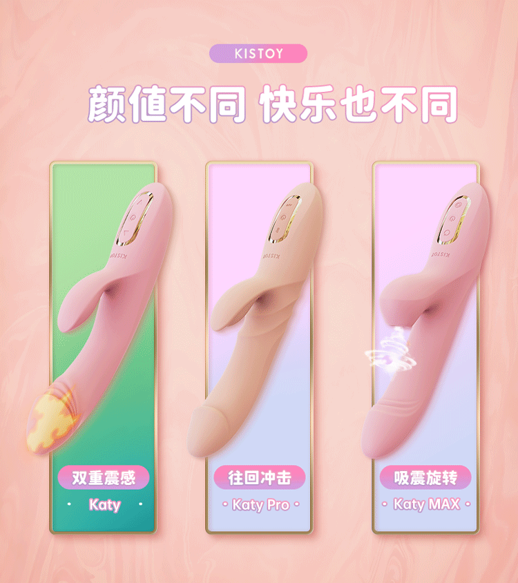 Kisstoy Katy 按摩棒系列以「高顏值+黑科技」走紅社交平台,主攻 G 點與 C 點雙重快感。9 檔震動搭載 38 °C 恆溫功能,矽膠機身貼服舒適,無論獨自探索抑或伴侶前戲,都能輕鬆解鎖高潮新高度。