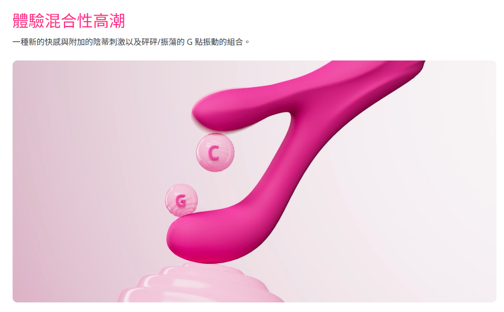 ✦ 雙重高潮快感:G點擺動(5段強度,4種節奏)+陰蒂震動(3段強度,4種節奏),全方位快感升級