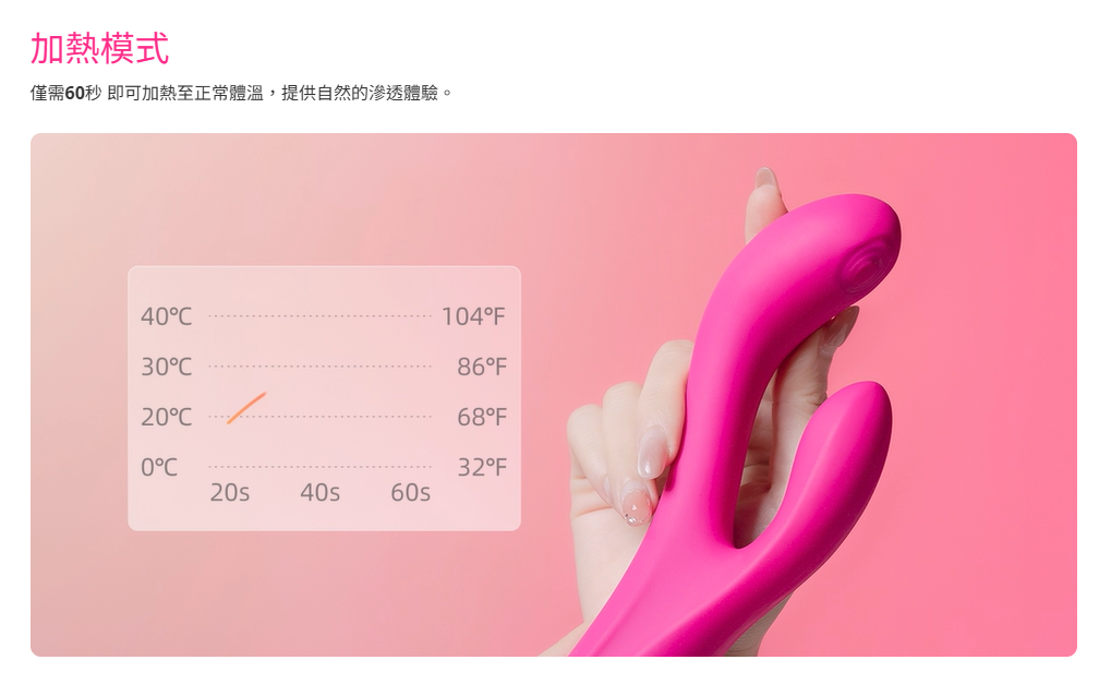 ✦ 智能加熱功能:插入部位能迅速升溫至38~42°C,模擬體溫,增加情境真實感