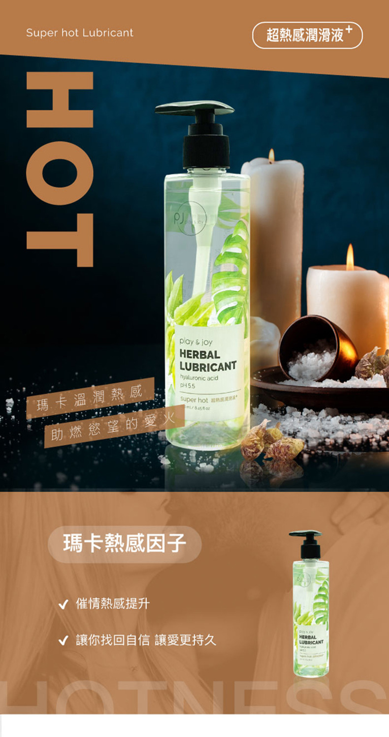PLAY & JOY 超熱感潤滑液是一款將潤滑和按摩功能結合的多用途產品,專為希望提升親密體驗的用戶設計。這款潤滑液內含天然瑪卡萃取物和海藻玻尿酸,不僅提供長效保濕,還能幫助女性使用者改善性福感和緊緻度。特別適合於前戲時進行全身按摩,或直接用於敏感部位提升舒適感,讓每一次的親密互動都更加愉悅。