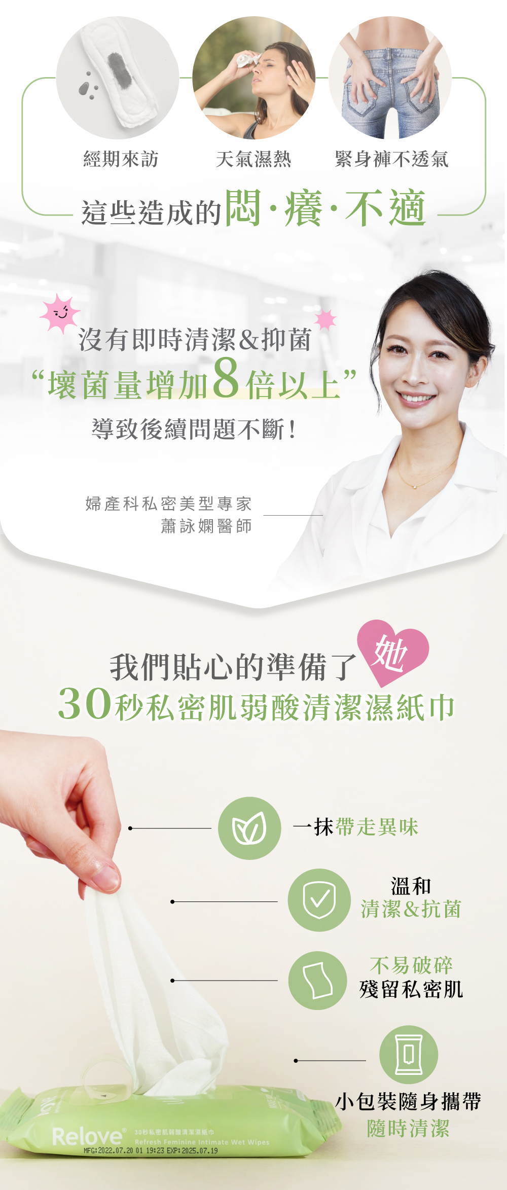 Relove 私密肌30秒面膜濕紙巾Relove 私密肌30秒面膜濕紙巾是專為女性設計的弱酸清潔濕紙巾,專注於維護私密部位的健康與清爽感。無論是在經期、炎熱天氣或是穿著緊身衣物時,這款濕紙巾都能即時清潔,快速帶走悶熱、癢感與異味,減少細菌滋生,防止不適感加劇。每片濕紙巾都經過婦科專家蕭詠嫻醫師的推薦,配方溫和、不刺激,讓您隨時隨地保持私密肌膚的舒爽。