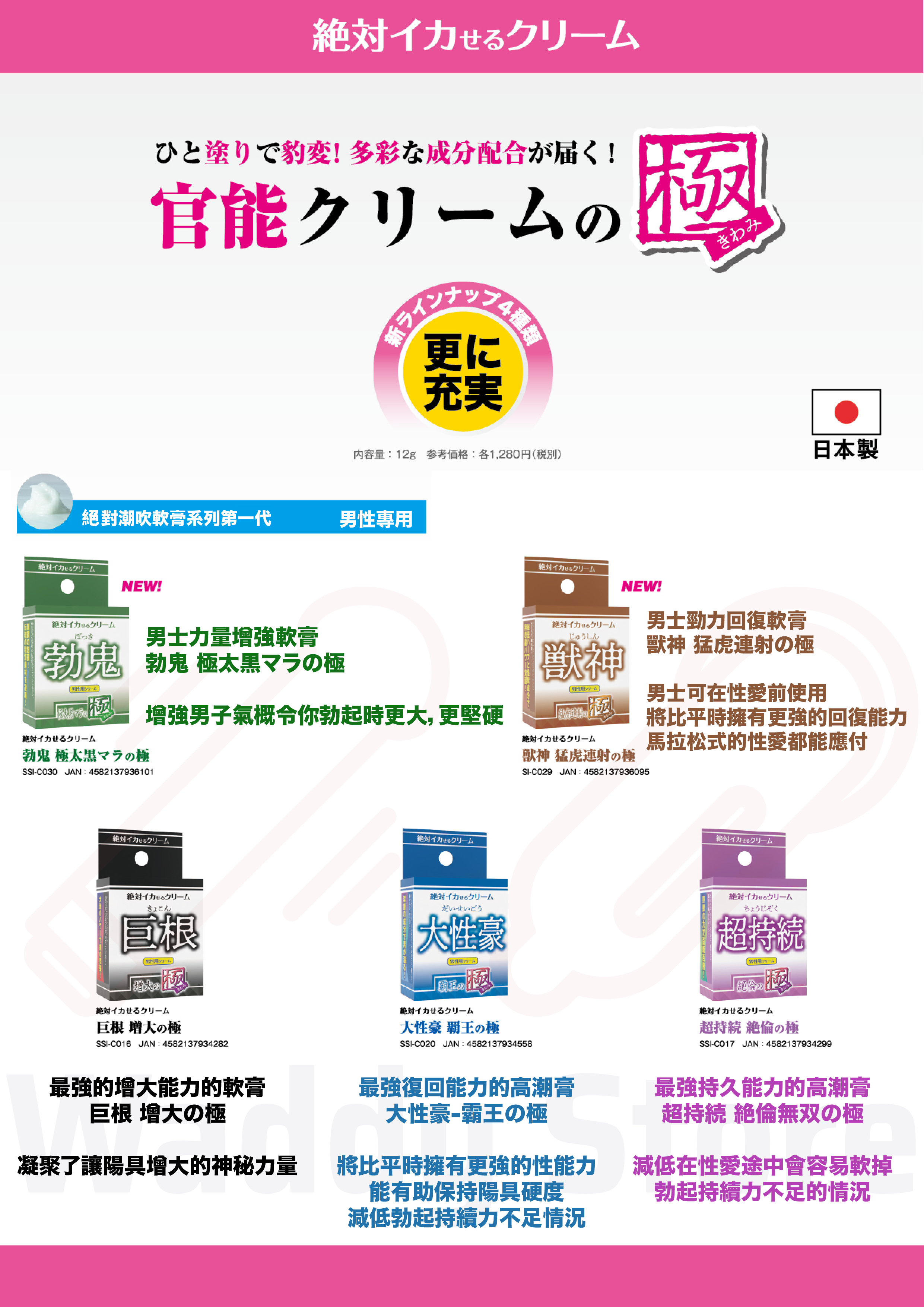 SSI Japan 勃鬼 極太黒マラの極 是專為提升男性力量而設計的增強軟膏,由日本職人嚴選天然成分,以黃金比例配製而成,有效提升男性的勃起硬度和尺寸,讓你在每次的親密時刻中表現出極致的力量。