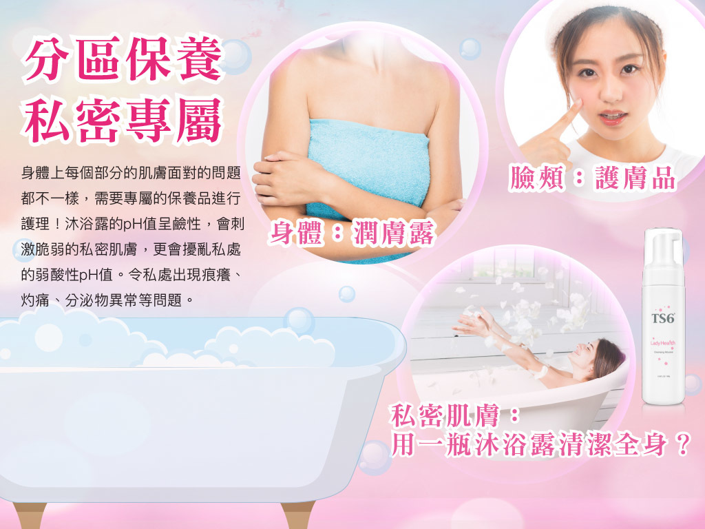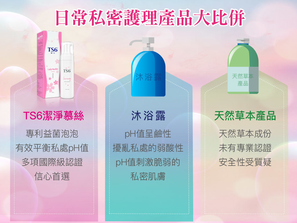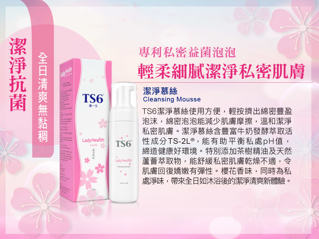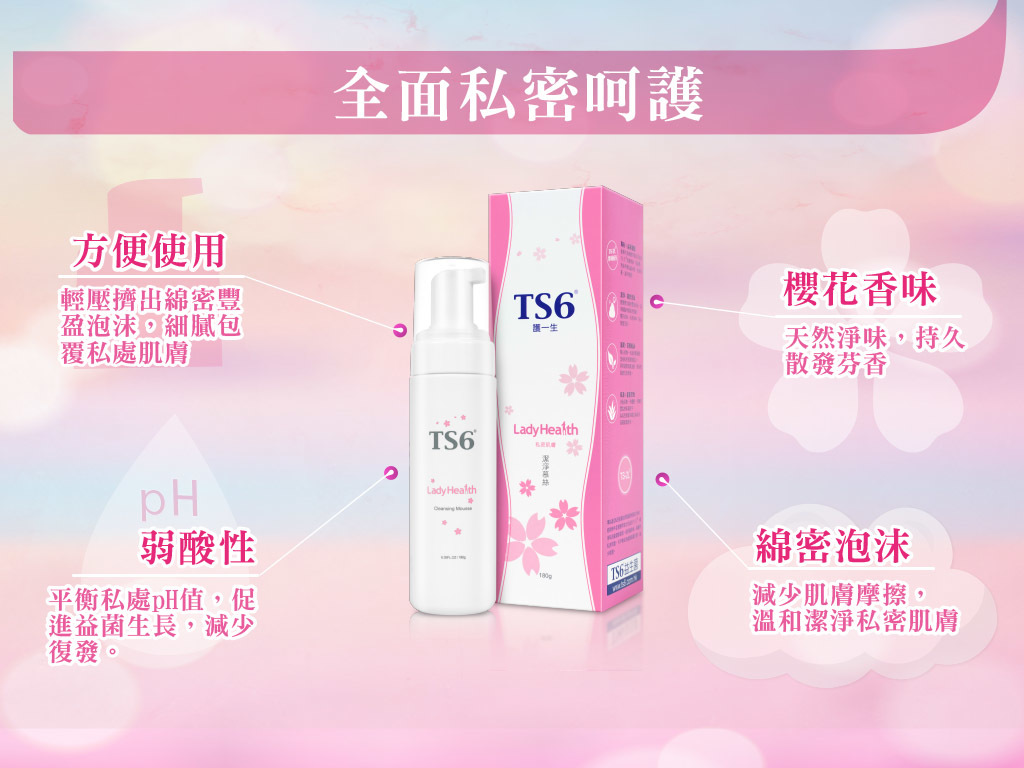 TS6 潔淨慕絲是一款專為女性私密部位設計的泡沫清潔產品,內含專利益生菌,能夠細膩潔淨並有效抗菌。這款慕絲不僅能夠潔淨污垢,還能滋潤和保濕私密肌膚,讓您在日常生活中保持舒適與自信。無論是日常清潔還是特別時期的護理,TS6 潔淨慕絲都是您的理想選擇。