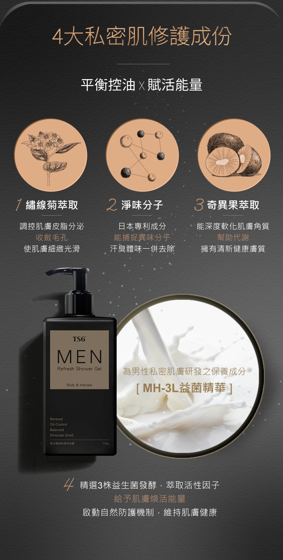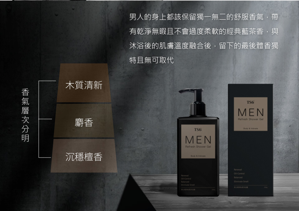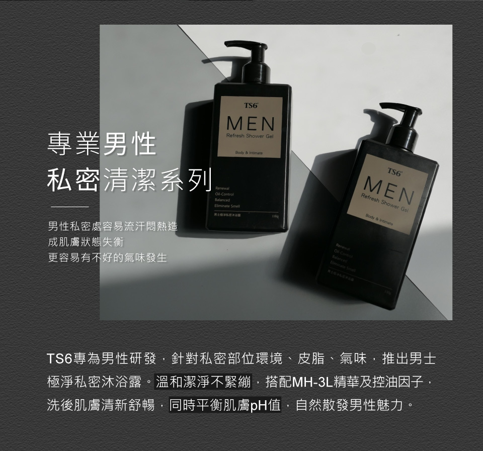 TS6 男士極淨私密沐浴露專為男性私密肌膚設計,提供深層潔淨同時不緊繃的舒適體驗。配方中加入MH-3L益菌精華及多種植物萃取成分,有效控油、收斂及促進肌膚代謝,保持私密部位的清爽和健康。獨特的淨味因子與麝香氣息,讓男性魅力自然散發。