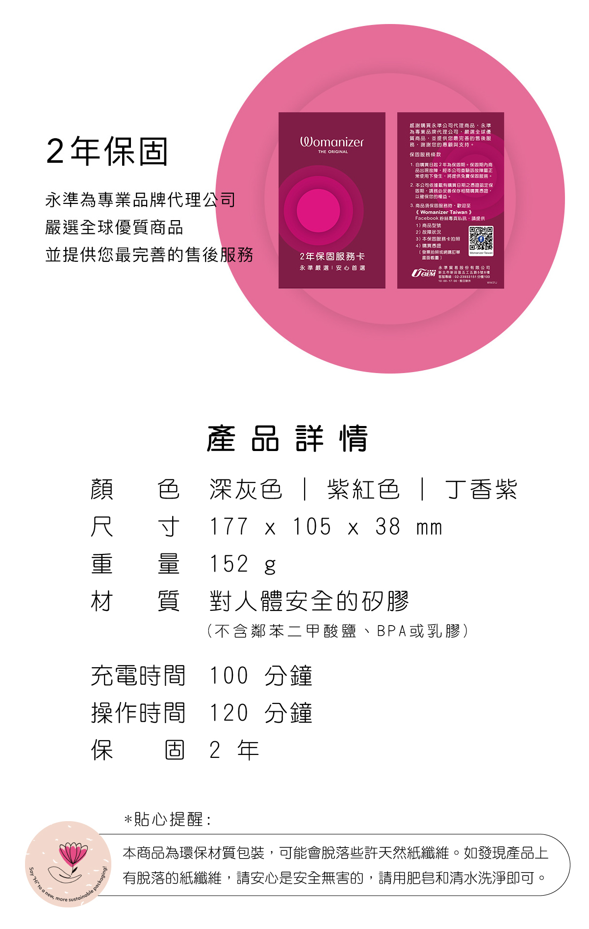 設計上,Womanizer OG的彎曲形狀貼合人體,並且配有柔軟的矽膠材質,帶來極致舒適的感覺。防水設計(IPX7)讓您可以輕鬆清潔並在任何地方使用,為您的私密時光增添無限樂趣。