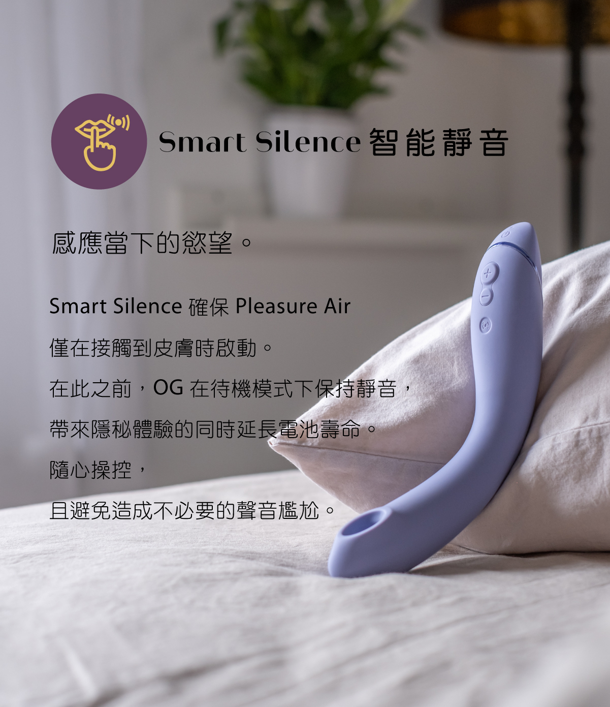 此外,Womanizer OG具備智能靜音功能,只有在與皮膚直接接觸時才會啟動,這樣不僅能節省電池,還能減少噪音干擾。短按減號按鈕即可啟用Afterglow模式,讓您在高潮後輕鬆過渡至放鬆狀態。