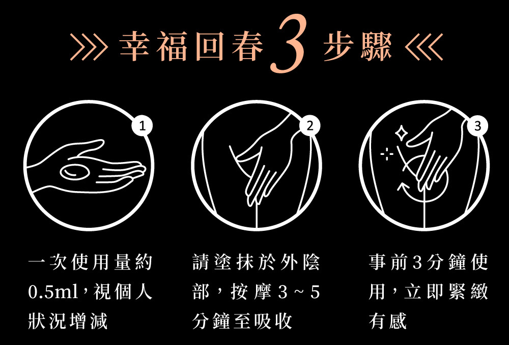 日常保养:建议沐浴清洁后,取0.5ml的RELOVE 紧依偎,并均匀擦在外阴部,然后轻轻按摩,直至凝胶完全被肌肤吸收。视乎个人情况,可酌量增加用量。