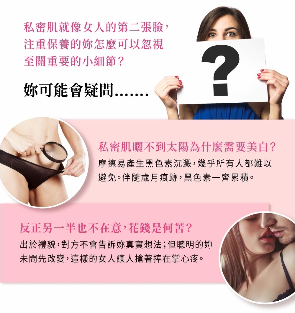 独家私密肌肤美白配方,改善私密肌肤暗沉,有效抑制黑色素生成,恢复少女般的粉嫩肌肤
