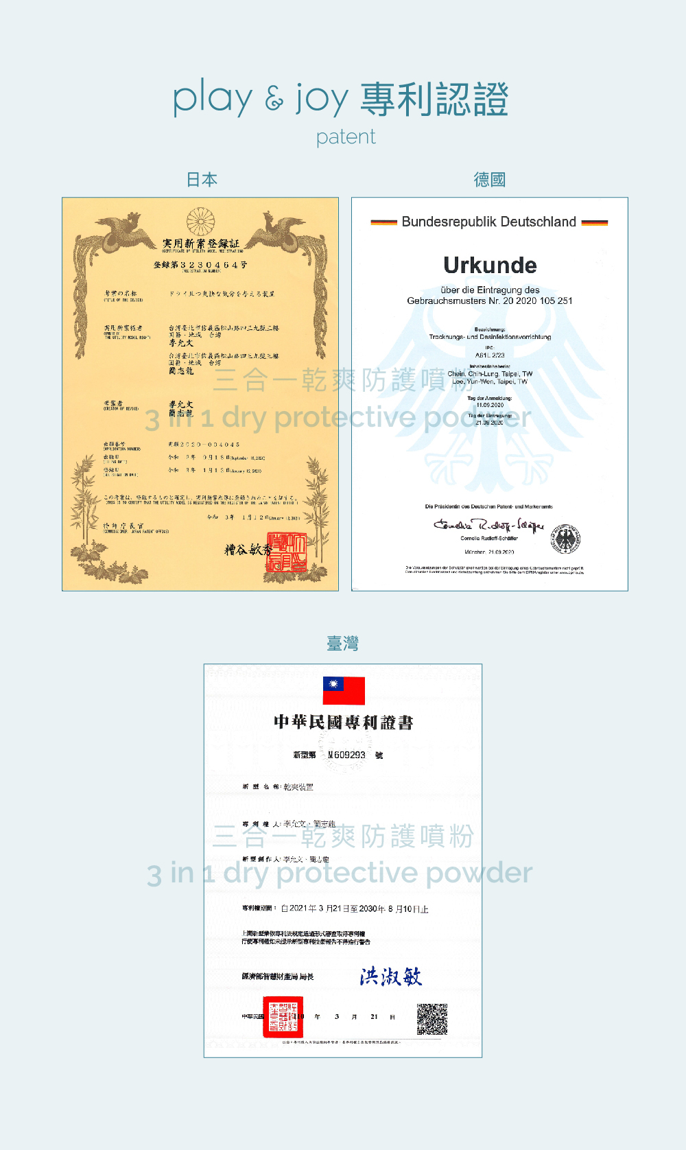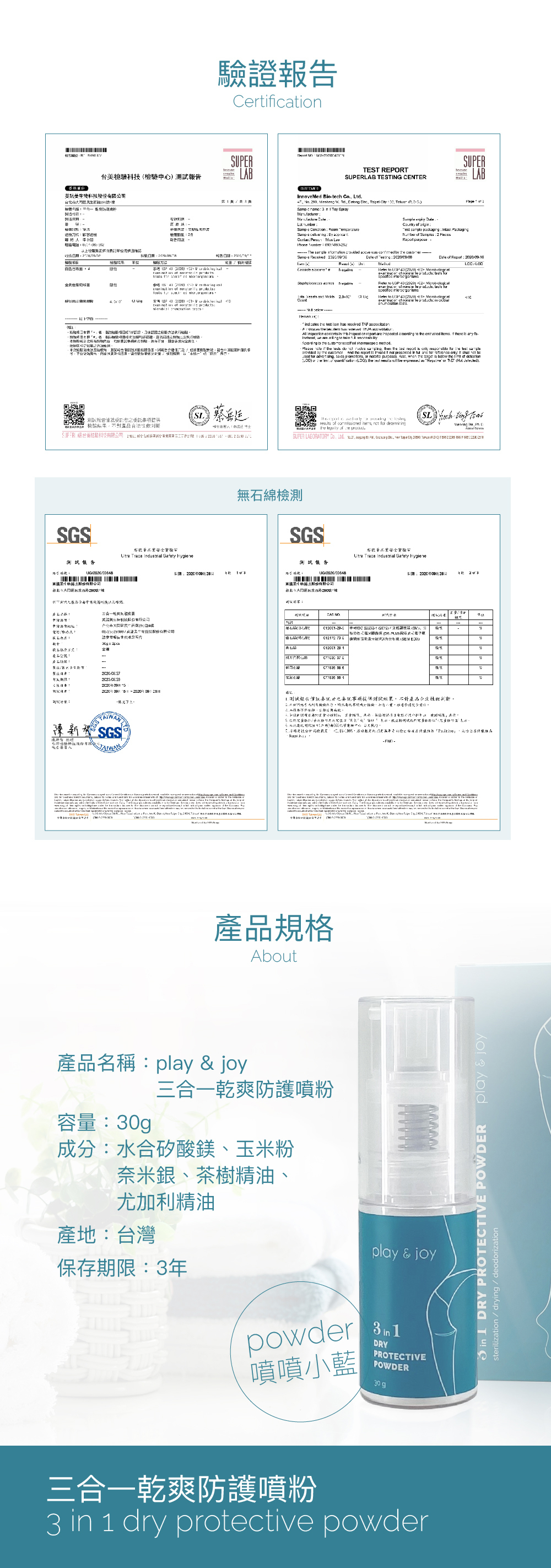 PLAY & JOY 三合一乾爽防護噴粉(15g)採用專利配方設計,結合水合矽酸鎂、玉米粉、奈米銀粒子、茶樹精油及尤加利精油,有效抑制細菌滋生、去除異味並保持長時間的乾爽。經過歐盟CE及SGS國際標準認證,保證產品安全及高效,讓您在任何環境下都能保持舒適清爽。